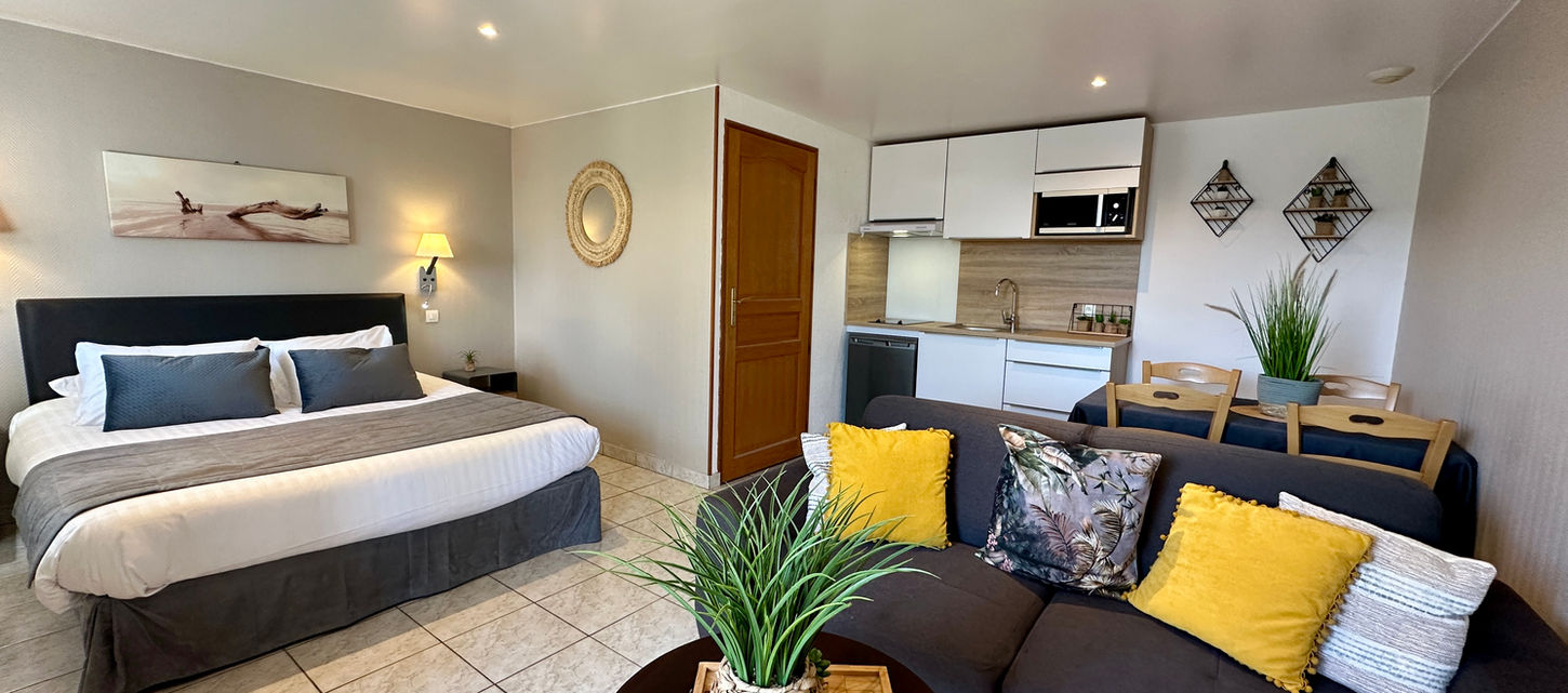 Cuisine bien équipée : frigo, plaque vitrocéramique 2 feux, four micro ondes, cafetière électrique traditionnelle, bouilloire électrique, grille pain.